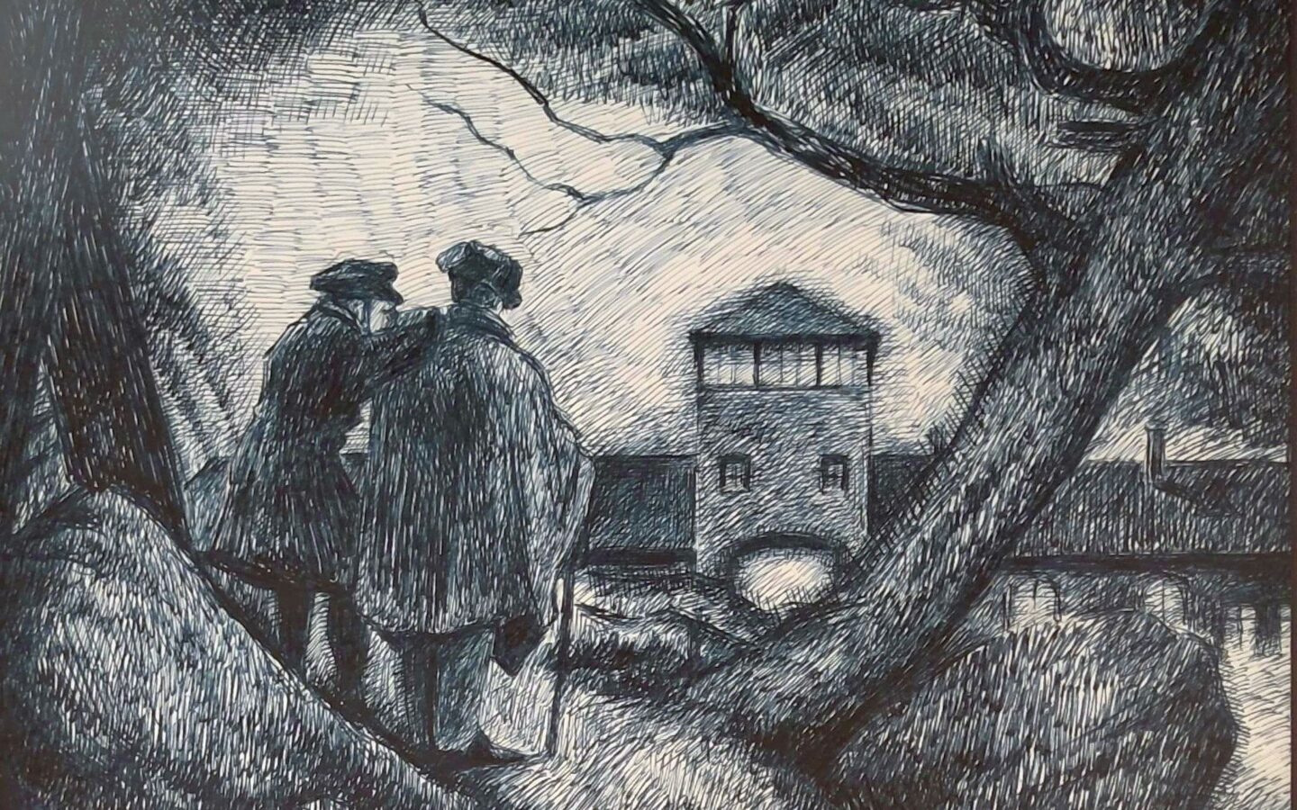 Zwei Männer in Betrachtung des Mordes, STAUDINGER, 2024, Zeichnung, Tusche auf Papier, 42x30